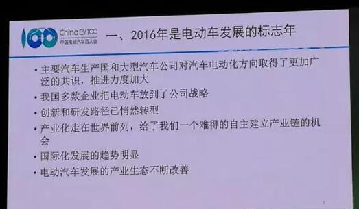 有专家说2016年是电动车发展的标志性一年,我认真思考之后,认为这一说法不无道理。我想可以从两方面来看,一个方面是从全球来看,在2016年这一年,发达国家主要汽车生产国,包括大型汽车公司,大家对汽车发展的低碳化、智能化、信息化取得了进一步的共识,而且各个国家都把电动车作为提高国家竞争力的一个制高点,我想各个公司之间的激烈竞争都在潜伏之中。