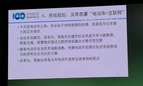 第五,要系统规划,及早部署“电动车+互联网”。今天的电动车之热,并非由于传统能源的枯竭,而是因为它有很强大的正外部性。电动车的低碳化、信息化、智能化的潜在社会效益只有与新能源、智能交通、智慧城市通过互联网有机融合才能发挥。目前大家对电动车关注的还是作为车的基本功能。随着这些方面的成熟,挖掘电动车潜在社会效益将成为政府和企业关注的主题。信息化、智能化将是未来电动车差异化竞争的制高点,这里有太多的文章可做。目前辅助驾驶、无人驾驶已经走在前面,我想国家应该及早对电动车与分布式能源、智能交通、智慧城市以及5G通信协同发展、统一规划、开展顶层设计、超前部署、抓紧启动,引导企业的技术开发和基础设施建设,推进“电动车+互联网+交通”,把阶段性技术成果用于提高交通效率、降低物流成本、保证交通安全,使其产生经济和社会效益。