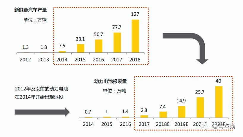 回看新能源汽车近十年发展历史,其在2012年产量突破1万辆,2014年开始出现爆发性增长。到2018年,产量已经突破100万辆,正好是2012年产量的100倍。随着新能源汽车产销量的连续放量,一个不容忽视的问题逐渐浮出水面:退役动力电池何去何从?