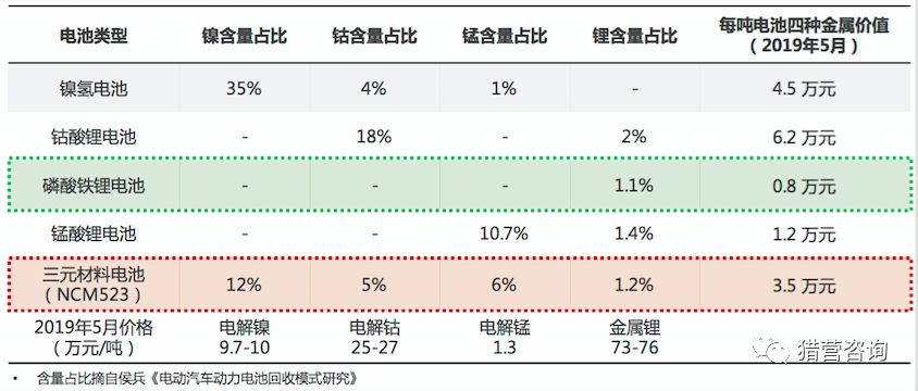 当前动力电池主要是磷酸铁锂电池和三元材料锂电池。显然,三元材料电池更具经济性,更有回收价值。