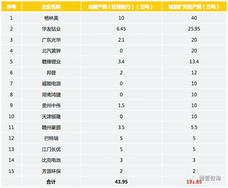 规划产能top15(注意:预计到2021年电池报废量是40万吨)