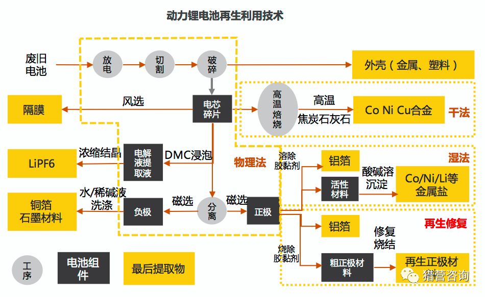 动力电池的再生利用技术,分为物理法、化学法和再生修复。化学法又分为干法和湿法。其中的化学法主要适合三元材料电池。再生修复主要适用于磷酸铁锂电池,但尚在研究阶段。