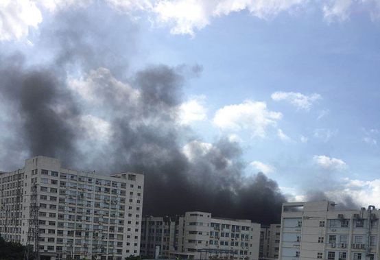 6月20日早上,深圳市坪山区龙坪路比亚迪厂区内一栋厂房的4楼起火,厂房上空黑烟滚滚,几公里外清晰可见。
