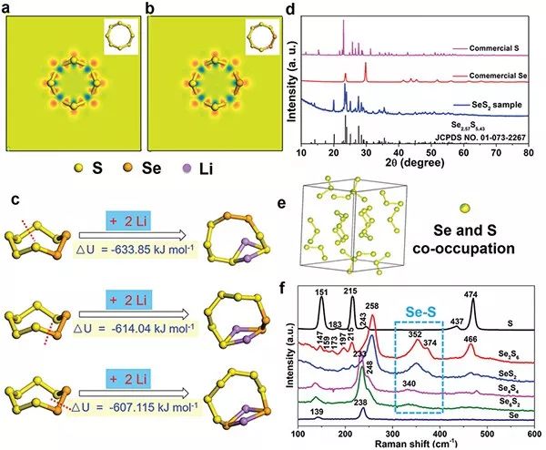 为了揭示SenS8-n(n=0,1,2,…,8)环的详细化学特性,文章研究了从S8到Se8共30种可能的分子结构的电子密度分布,结果显示均具有相似的电子密度分布,归因于S和Se具有相似的化学性质;但相比于S8,由于Se原子较高的p轨道和较低的电负性,导致在SenS8-n中能诱导更多的态密度,因此S原子能获得更多的电子密度,从而提高整体的电导率。XRD图谱初步确定了SeSx固溶体的形成, Se和S而不是简单的物理混合;此外,拉曼光谱中显示在SenS8-n中存在Se-S键,尤其在富S样品(Se2S6和SeS2)中Se-S键的特征峰较强,进一步证实了XRD检测的结果。