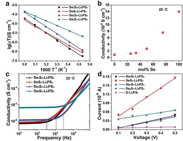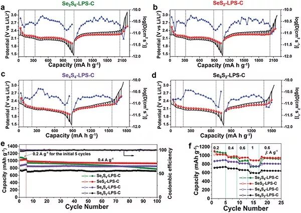 为了研究SeSx正极的离子和电子特性,作者选择了SeSx和Li3PS4的混合物(SeSx-LPS)来评估。在常温下,随着Se摩尔含量的增加,离子电导率呈增长趋势,尤其当Se的摩尔含量超过50 %时,离子电导率急剧增加。在室温下对SeSx-LPS和S-LPS复合材料在不同施加电压下的电流响应结果(图2(d))显示,随着Se含量的增加复合材料的电导率并没有单调增加,这与理论是不符的,但四种SeSx-LPS材料的电导率均远远高于S-LPS,引入Se的确是改善了离子和电子传导性,经分析电导率的改善主要并不是由于SeSx在引入Se时的电子特性所致,而是更多地依赖于SeSx和LPS之间的相互作用。