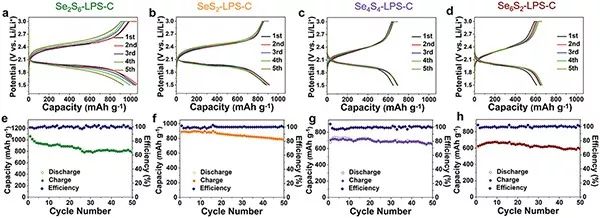 为了研究不同计量比的SeSx在电池中的表现,作者将SeSx、Li3PS4、C混合(SeSx-LPS-C)作为正极在不同条件下进行了相应的电化学测试。在前五个循环,Se2S6-LPS-C正极表现出容量衰减,并且电荷分布的极化明显增加;相比之下,其他三个SeSx-LPS-C正极显示出相对稳定的循环性能,初始循环的充放电曲线几乎重叠。随着SeSx固溶体中Se含量的增加,第五次循环后,四个正极的可逆容量分别为930,889,747和665 mAh/ g,相当于其对应理论容量的76 %,79 %,77 %和82 %。结果表明,由于电子电导率的增加,SeSx正极中的Se组分有助于提高活性材料的利用率,更重要的是,较高的Se含量可以导致更稳定的长期循环性能(图3(e-h)。尽管如此,较高的Se含量也导致了较低的理论和实际比容量,综合来看,SeS2-LPS-C正极表现出更优秀的容量和稳定性。