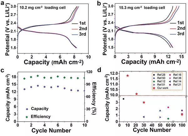 (a-b)不同SeS2负载量的充放电曲线:a)10.2 mg/cm2,b)15.3 mg/cm2。