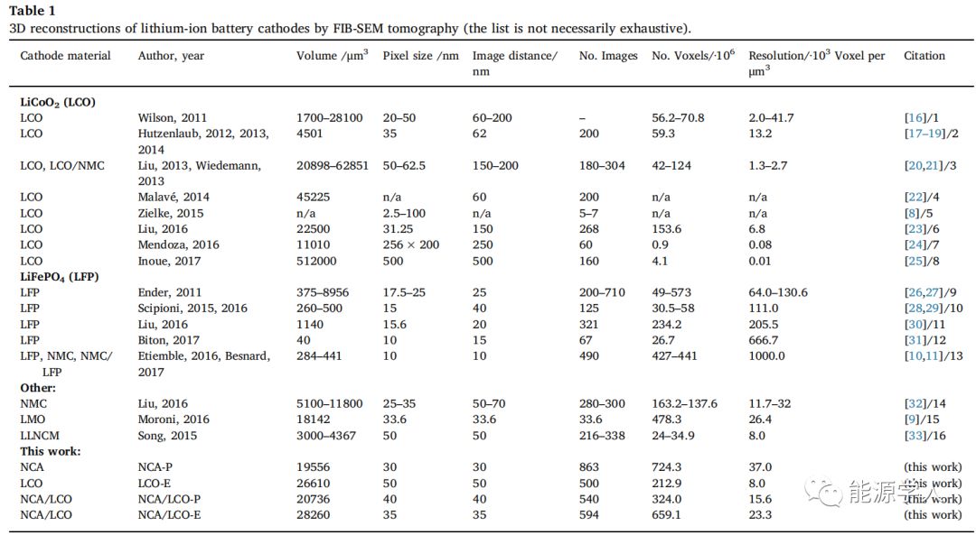 聚焦离子束扫描电子显微镜(FIB-SEM)层析成像常用于多孔电极的三维微观结构重建,通过聚焦离子束进行切片,在纳米范围内控制材料的精度。在连续切片过程中,作者收集了数百个二维扫描电镜图像(像素大小为10-60 nm;距离通常为10-200 nm;见上表1)。根据具体设置,每幅图像的铣削和成像通常需要1分钟以上,因此对于由500–700幅图像组成的重建,则需要一天以上的采集时间。并且,如果重建体积更大,则需要2-3天的采集时间。FIB-SEM断层扫描对三维LIB重建的文献综述如表1所示,表中列出了重建体积、像素大小、图像距离、体素数量和图像数量,以及相应的正极材料和分辨率等重要参数。可以看出,文献中的大多数重建分析的正极为LiCoO2(LCO)和LiFePO4(LFP),重建LiNixMnyCo1-x-yO2(NMC)和LiMn2O4正极的文献较少,更重要的是,LiNiCoAlO2 (NCA)和LiNiCoAlO2- LiCoO2 NCA/LCO正极的重建完全没有报导。