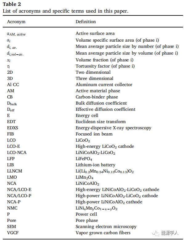 在本文中,卡尔斯鲁厄理工学院L. Almar等人对四种从功率锂离子电池中获得正极进行FIB-SEM断层扫描分析,电池的额定容量从350mAh到2600mAh,收集的体素尺寸为30-50 nm,其总体积在~19500μm~28000μm3之间。这是单个炭黑颗粒的分辨率和代表性体积元素之间的良好折衷。测试样品被硅酮渗透,采用全局和局部阈值算法对灰度值集合进行分割,较大的数据集和/或较长的铣削时间会导致灰度值分布移动,这一点非常重要。根据作者的经验,计算出的微观结构,其参数精度对这一中间阶段非常敏感。因此,作者在文章中介绍了三种不同正极的体积分数、表面积、粒径、连通性和弯曲性(活性材料、炭黑结合相和孔相)等参数设置,可以在均匀化模型中的更好的建模,并用来精确地表示电极的微观结构。上表2列出了本文中使用的所有缩略语和具体术语。