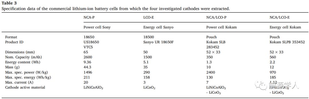 表3. 从商用锂离子电池中提取四种不同正极的规格和数据。