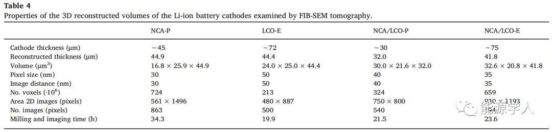 表4. FIB-SEM断层扫描得出的三维重建锂离子电池正极特性。