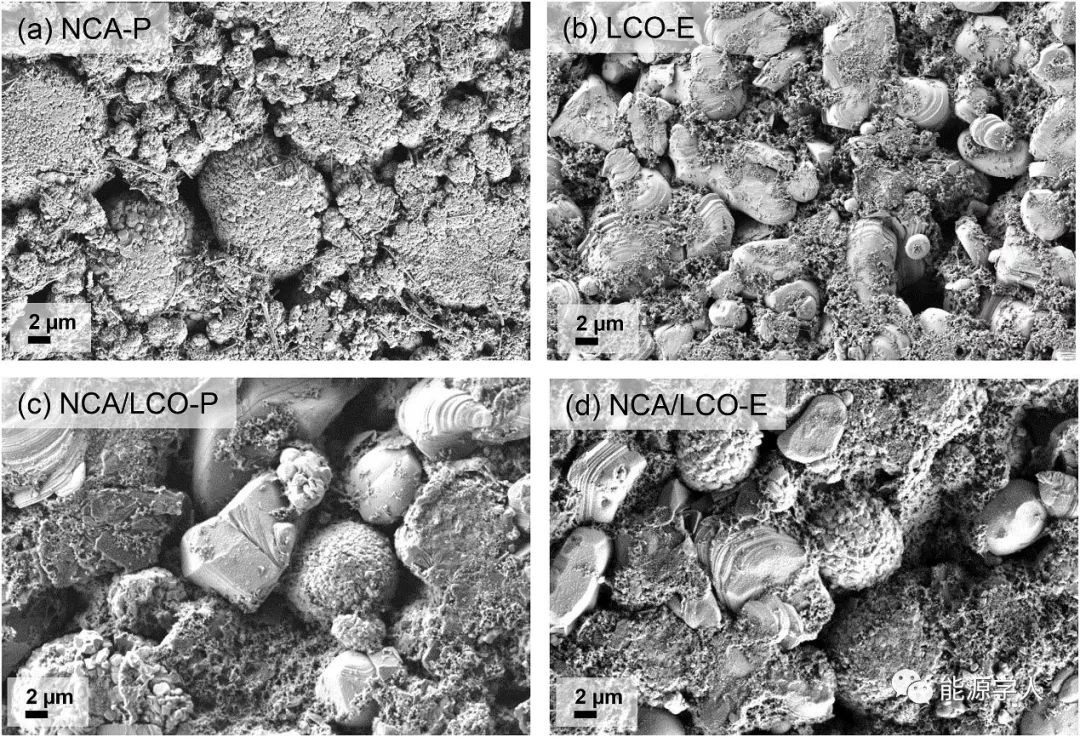 图1a为大功率圆柱形电池的NCA-P正极,由混合有碳纤维的LiNiCoAlO2颗粒和团聚的细碳黑颗粒制成,可以看到NCA材料形成较圆的团块,具有明显的双峰尺寸分布,由次级NCA颗粒组成。图1b中的LiCoO2 (LCO-E)由表面光滑的致密颗粒组成,团聚的、细小的炭黑颗粒非常明显,但没有碳纤维。大功率NCA/LCO-P和高能NCA/LCO-E混合正极的SEM分别如图1c和1d所示,乍一看,这两种混合正极之间没有显著差异,但混合正极中的两种活性物质LiNiCoAlO2 (NCA)和LiCoO2(LCO)可通过上述特征清楚区分。这种对于相体积、表面积、粒径分布或弯曲度的量化是非常有价值的,但不能仅基于二维数据集就进行重建,这样很容易产生误导。