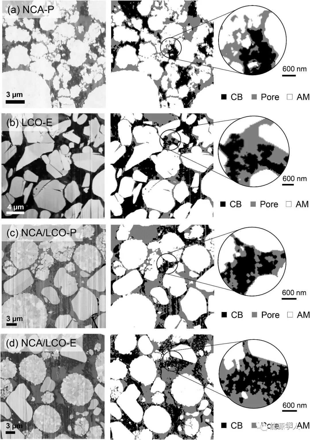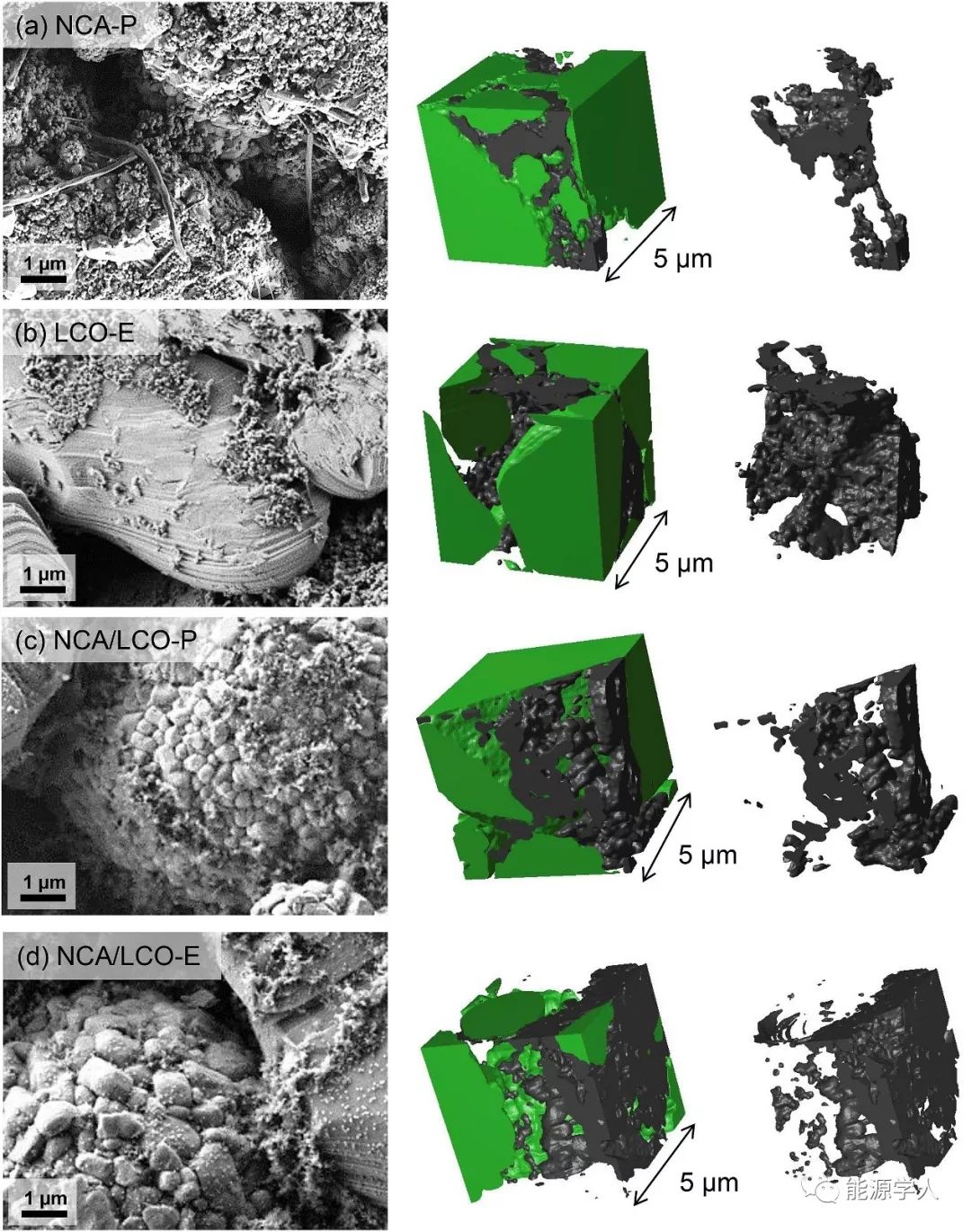 图2. FIB-SEM断层扫描图像:(a) NCA-P, (b) LCO-E, (c)NCA/LCO-P,(d) NCA/LCO-E,图中显示出三个相:白色为活性材料,黑色为碳粘结剂,灰色为孔隙。
