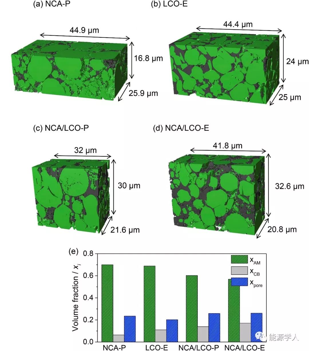 图3. 三维重建体积显示活性物质(绿色)和碳(黑色)相的分布:(a) NCA-P, (b)LCO-E, (c) NCA/LCO-P,(d) NCA/LCO-E;(e)为活性材料(AM)、碳粘结剂(CB)和每个重构正极中孔隙相的体积分数(xi)。
