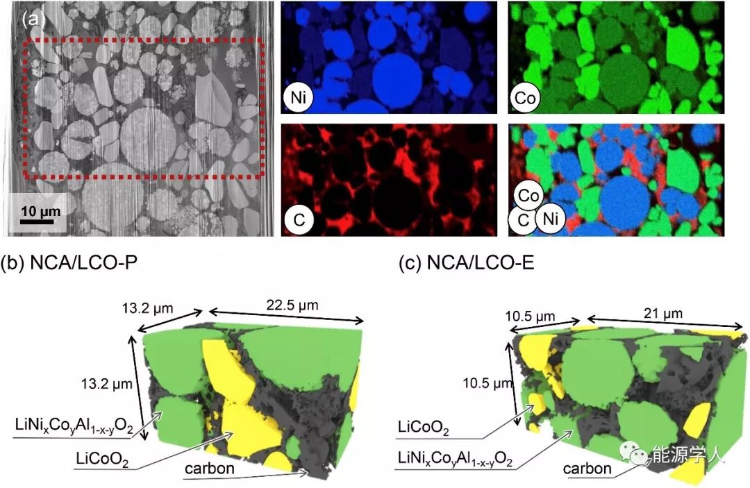 随后,作者又利用SEM-EDXS对混合正极进行了进一步分析,以确定活性材料的详细组成,上图4a为NCA/LCO-E正极的FIB-SEM图像,该正极中含有可进行能量分散X射线光谱(EDX)分析的标记区域。图4a右边的是四元素分布图,镍和钴元素来自于LiNiCoAlO2和LiCoO2活性物质颗粒,碳元素证实了碳相的存在,并没有检测到阳离子分离或任何二次相。此外,在上图4b和图4c中,NCA(绿色)和LCO(黄色)之间的分割是手动完成的。作者目前仍在开发不同活性材料之间的自动鉴别算法,并正在寻求可能的方法,包括基于特征颗粒形态或基于颗粒内晶向对比度的分割算法。但不管怎样,从上图可以看出,NCA粒子由许多次级粒子组成,由于它们的晶体取向不同,所以显示出稍微不同的灰度值,而LCO的灰度值都差不多。