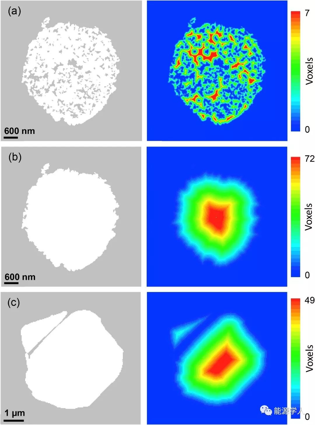 图6. 三种不同正极活性材料粒子的二维图像及其欧几里得距离变换(EDT)映射:(a)多孔LiFePO4 (LFP)团聚体,(b)闭合后的LFP团聚体,(c)致密LiCoO2 (LCO)粒子。
