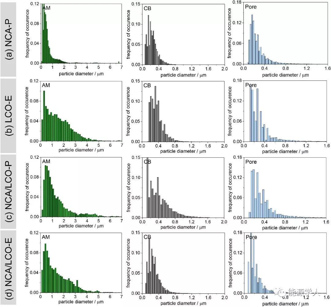 NCA-P阴极(上图a)显示了迄今为止所有活性材料相的最小平均粒子(团聚)尺寸,具有双峰(或三峰)分布。在图7b的活性材料粒度图中,LCO-E正极粒度、以及其碳相和孔相的粒度平均值分别为1.5μm、0.4μm和0.3μm。由于LCO颗粒是致密的,因此通过EDT得到的结果更接近于预期值。通过将活性材料相选为单相(NCA和LCO之间没有区别),并根据整个重建体积(图7c和d)计算混合NCA/LCO正极的粒径分布图。可以得到两种正极的平均值与活性材料相1.3-1.4μm、碳相0.3-0.4μm和孔相0.3-0.4μm的值均非常相似。