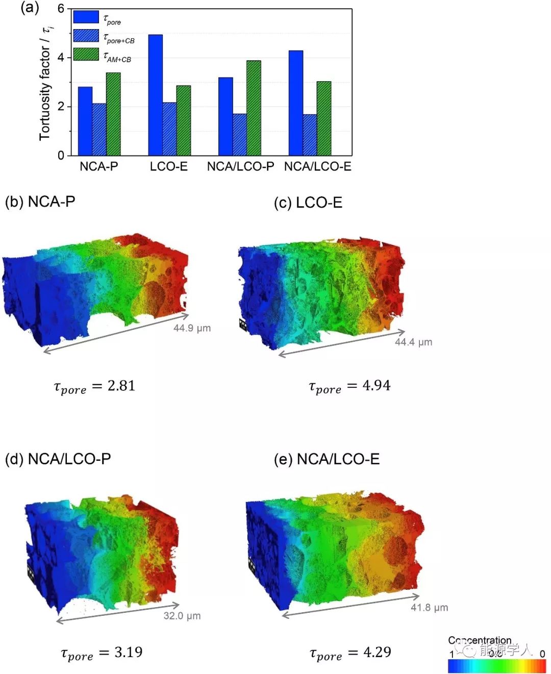 上图为计算出的弯曲度值,显然,高能电池(LCO-E andNCA/LCO-E)中的正极设计,使孔相中的弯曲度更高,分别为4.94和4.29,而高功率电池(NCA-P and NCA/LCO-P)的弯曲度分别为2.81和3.19。高功率应用的电极具有较低的弯曲度值,因为有效的离子导电性增加,高倍率下的电解质消耗可延迟。