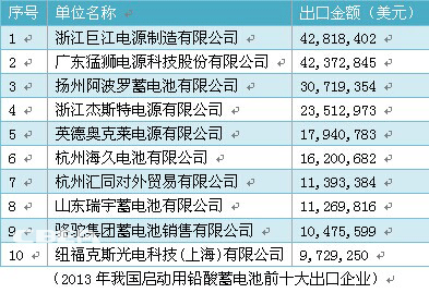 2013年,浙江巨江电源制造有限公司启动用铅酸电池出口额最高,达到42,818,402美元,广东猛狮电源科技股份有限公司以42,372,845美元的出口额排名第二。排名前十的企业总计出口额达到了216,433,088美元。