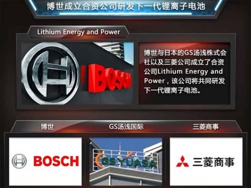 在9月2日的博世技术创新体验日中,博世集团董事会成员、亚太区负责人泰瑞来表示,博世与日本的GS汤浅株式会社以及三菱公司成立了合资公司,该公司将共同研发下一代锂离子电池,希望能够将电池的能效提升一倍。合资公司Lithium Energy and Power中,博世持股50%,GS汤浅国际与三菱商事分别持股25%,董事会也依持股比例组成。