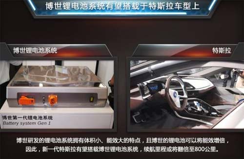 由于特斯拉Model S汽车的热销,使特斯拉对锂电池的需求达到了一个惊人的程度,未来想要保持稳定发展,就必须想办法解决锂电池供应量紧张的问题。博世研发的锂电池系统拥有体积小、能效大的特点,且博世的锂电池可以将能效增倍,因此,新一代特斯拉有望搭载博世锂电池系统,续航里程或将翻倍至800公里。