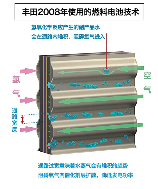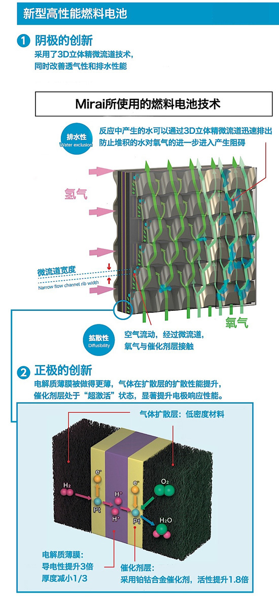 丰田Mirai搭载的燃料电池堆栈是由370片薄片燃料电池组成的,因此被称为“堆栈”,一共可以输出114千瓦的发电功率。此前我们也分析了大众集团的燃料电池技术,结构基本类似。丰田的燃料电池堆栈经历了十几年的技术优化,形成了自己的特色结构,比如3D立体微流道技术,通过更好地排出副产物水,让更多空气流入,有效改善了发电效率。所以整个堆栈的发电效率达到了世界先进水平,达到了3.1千瓦/升,比2008年丰田的技术整整提升了2.2倍。