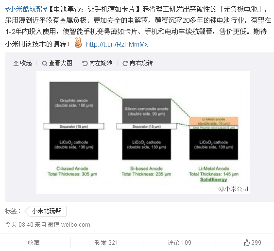 在今日更新的小米公司微博中,小米声称“麻省理工研发出突破性的‘无负极电池’,采用薄到近乎没有金属负极、更加安全的电解液,颠覆沉寂20多年的锂电池行业。有望在1-2年内投入使用,使智能手机变得薄如卡片……期待小米用该技术的请转!”