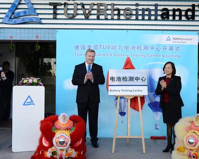 TUV莱茵深圳公司首席运营官胡莉莉女士和大中华区电子电气产品服务部周边设备总经理欧乐富先生为电动车电池实验室揭幕
