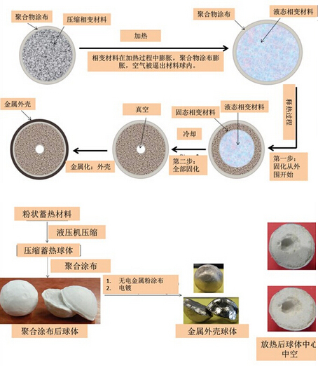 对于该储热球的制造和封装工序,研究人员首先采用液压机将这种粉状相变蓄热材料压缩,然后用一种低成本、可硬化并具有高渗透率的聚合物涂布将压缩后的相变材料包裹起来,再通过加热工序,使相变材料膨胀,聚合物涂布膨胀将空气逼出材料球内,形成真空。再通过放热过程,相变材料在球体内由外向内冷却成为固态,因空气在加热过程中被逼出,中心部位形成真空状态,然后采用电镀或高温烧结技术将包裹起来的相变储热球封装一层金属外壳或者陶瓷外壳。(见图1)