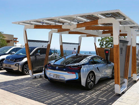 再比如宝马,大概觉得自家的i系列车型太过华丽,传统的充电方式实在难以匹配,于是,他们为i系列车型设计了专门的太阳能车棚。