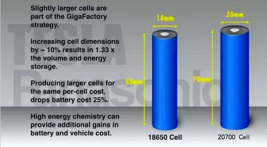 目前,特斯拉主要采用松下提供的18650钴酸锂电池,整个电池组包含数千块独立电池单元;该电池成本约为250美元/千瓦时,能够提供233瓦·时/千克的能量密度。未来特斯拉计划推出新的20700钴酸锂电池,该电池体积虽然更大(注:锂离子电池定义法则——如18650型,即指电池的直径为18mm,长度为65mm,0代表其是圆柱体型的电池。20700应代表直径为20mm,长度为70mm,圆柱形的电池),但在改进了化学成分(电解质和电极)之后提升了能量密度,因而在达到相同的功率要求时,所需要的电池模块数量减少,整个电池组重量将降低。