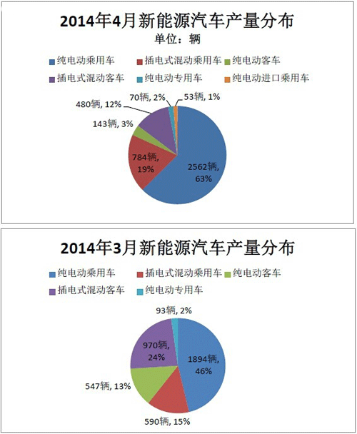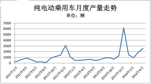2014年4月,全国车企生产纯电动乘用车2562辆,环比增长35.27%,同比更是高增超过3倍,增幅为359.14%。产量排名前三的上海华普、奇瑞、众泰,旗下高产量的电动汽车都带有微型电动车的基因,比亚迪、江淮等高速电动车品牌,市场销售还未大规模启动。另外,插电式混动乘用车增长较快,4月产出784辆,环比增加三成。