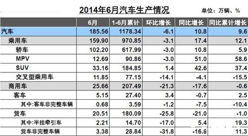 上半年,汽车产销1178.34万辆和1168.35万辆,同比增长9.60%和8.36%,与上年同期相比,增幅有所减缓。其中乘用车产销970.85万辆和963.38万辆,同比增长12.05%和11.18%;商用车产销207.49万辆和204.97万辆,同比下降0.59%和3.18%。