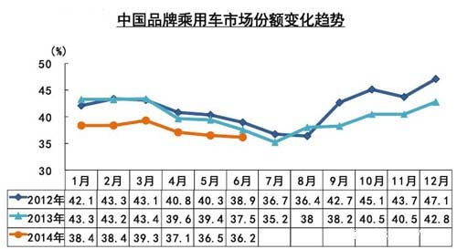 整个上半年,中国品牌乘用车市场份额一直在萎缩。共销售363.03万辆,同比尽管增长了1.78%,但大大落后与整体乘用车市场11.18%的涨幅。中国品牌乘用车市场占有率因此下降3.48个百分点。