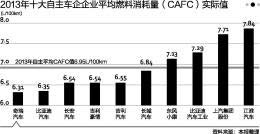根据工信部2013年3月发布的《乘用车企业平均燃料消耗量核算办法》,企业当年乘用车燃料消耗量实际值与目标值达到100%,即可获得优于目标值额度,反之将获得劣于目标值额度。上述报告称,将有22家未达标企业获得劣于目标值额度,后三位企业分别为北汽银翔、北汽股份和广汽乘用车,均为自主企业。
