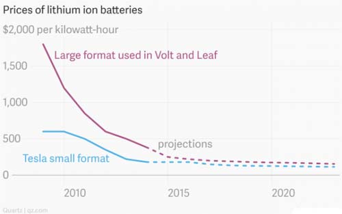 Musk的电池成本已经比其他厂商要低了,这是因为包括通用在内的制造商都是“白手起家”,不得不使用“袋状”或是金属矩形电池,而特斯拉采用的是松下的高容量电池,而这款电池的价格在过去二十年里持续走低。松下“18650”电池比普通AA电池略大,每千瓦时成本约200到300美元,前文提到的尼桑的成本是380美元每千瓦时。