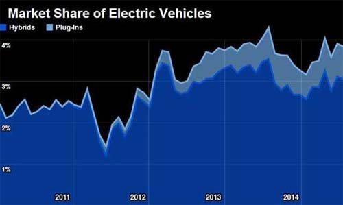 今年8月,电动车的销售再一次较上月出现下滑。市场对电动车的兴趣并未减弱,但是混合动力(HYbrid)和PLUG-IN(插电式)电动车合计仅占据汽车销售市场4%的份额,表明消费者还没有真正开始涌向电动车。在上述配图中,深蓝色代表混合型汽车,浅蓝色代表插电式混合动力车。把它们合并在一起,也就是所谓的电动车的总称。
