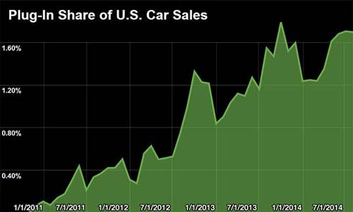 2014年,插电式电动车占据了美国汽车销售总量的约1.5%。虽然这一比例依旧不高,但是市场份额的增加值已经超出了预期。按照这一趋势,插电式电动车将会在本世纪末成为市场主角,超越燃油汽车。