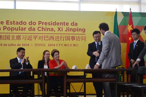 签署仪式在巴西当地时间7月17日举行,国家主席习近平和和巴西总统罗塞夫在总统府共同见证。在35家签约企业中比亚迪是唯一一家中国新能源汽车企业。