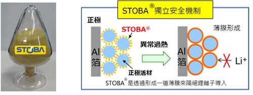 高安全电池材料 STOBA 是一种纳米级树枝状结构的高分子化合物,当锂电池发生异常,产生高温时,会形成一道薄膜阻隔锂离子间的流动,稳定锂电池,藉以提高电池安全度。在台湾已有 E-bike、电动摩托车及智能手机等产品应用高安全电池材料 STOBA 在其电池产品。