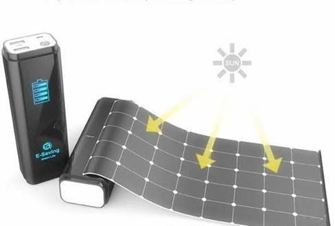 今年年初一款概念型可伸缩电池板的太阳能充电宝 eSaving 面世。eSaving 是一个手电筒模样的太阳能充电棒,它体型小巧方便携带。在 eSaving 的设备正面配备有一个可显示电量储备情况的显示屏。亮点在于,它的太阳能电池板可以进行自由伸缩,人们可以根据场地大小来自行调节太阳能吸收面积。当然,作为储电输出设备,eSaving 的顶部还设置了两个 USB 接口、一个电源插口以及开关电源键。