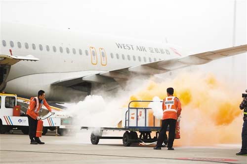 10月28日,重庆机场举行危险品应急处置联合演练。机场工作人员正在用灭火器控制“火势”。