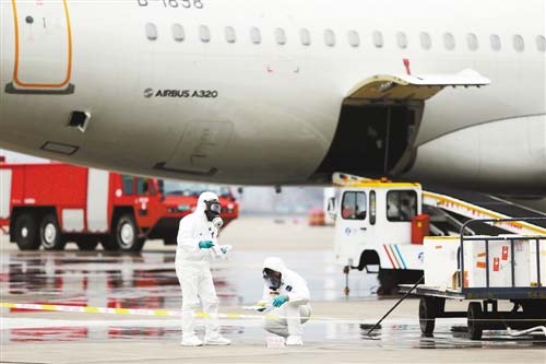 14时39分,市环保局辐射应急处置人员和市辐射环境监督管理站应急救援队伍到达现场,分别排查机组和地面人员,并探明污染区域和范围,还专门对飞机周围更大范围进行场地辐射监测和空气污染监测。