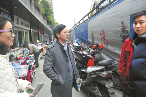 1月30日,成都西玉龙街,四川省人大代表、川大华西医院教授甘华田(中)了解电瓶车电池回收情况。