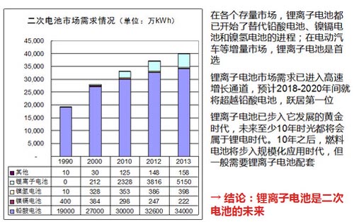目前人们常见的二次电池主要有铅酸电池、镍氢电池、镍镉电池、锂离子电池、液流电池(如钒电池、锌溴电池等)、钠硫电池等等。图3是各种二次电池的市场发展情况。从图3可以看到,二次电池市场目前基本上就是铅酸电池和锂离子电池两强争霸,但是,铅酸电池市场的发展速度不仅远低于锂离子电池,而且其很多固有市场都在被锂离子电池所取代,如电动自行车、移动基站电源等。可以认为,二次电池技术发展已进入到锂离子电池时代。