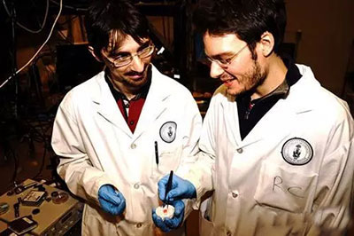 研究者ValerioAdinolfi(左)和RiccardoComin在测试钙钛矿晶体。在薄膜太阳能技术方面,该材料正吸引着大家的兴趣,但其作为完美的单晶体还未被研究。(来源:密歇根大学工程学院)
