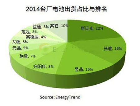 2014年台湾太阳能电池片虽垄罩在美国反倾销调查阴影下,但根据TrendForce旗下新能源事业处EnergyTrend最新的调查报告,随着产能增加及转换效率提升,全年出货再创新高峰,正式突破10GW大关,发货量年成长高达20%。