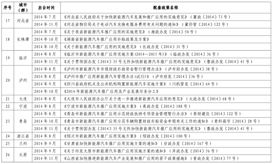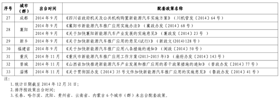 ]列入新能源汽车推广应用城市(群)的39个城市(群)88个城市,截至2014年底,有33个城市(群)70个城市出台了新能源汽车推广应用配套政策措施。