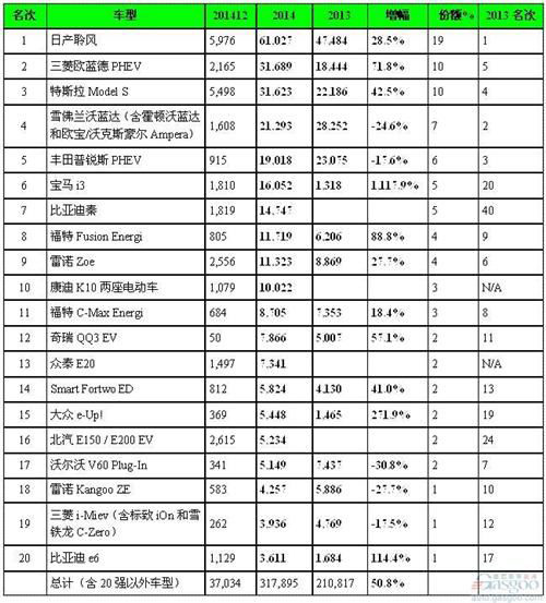 根据统计机构数据,2014年全球电动车(含纯电动车和插电式混合动力车)总销量达到31.8万辆,排名前20位的车型中,日产聆风依然领跑,而比亚迪秦等6款中国车登榜。