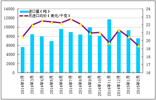 图1 2014年2月-2015年2月多晶硅进口量及进口均价示意图 数据来源:海关